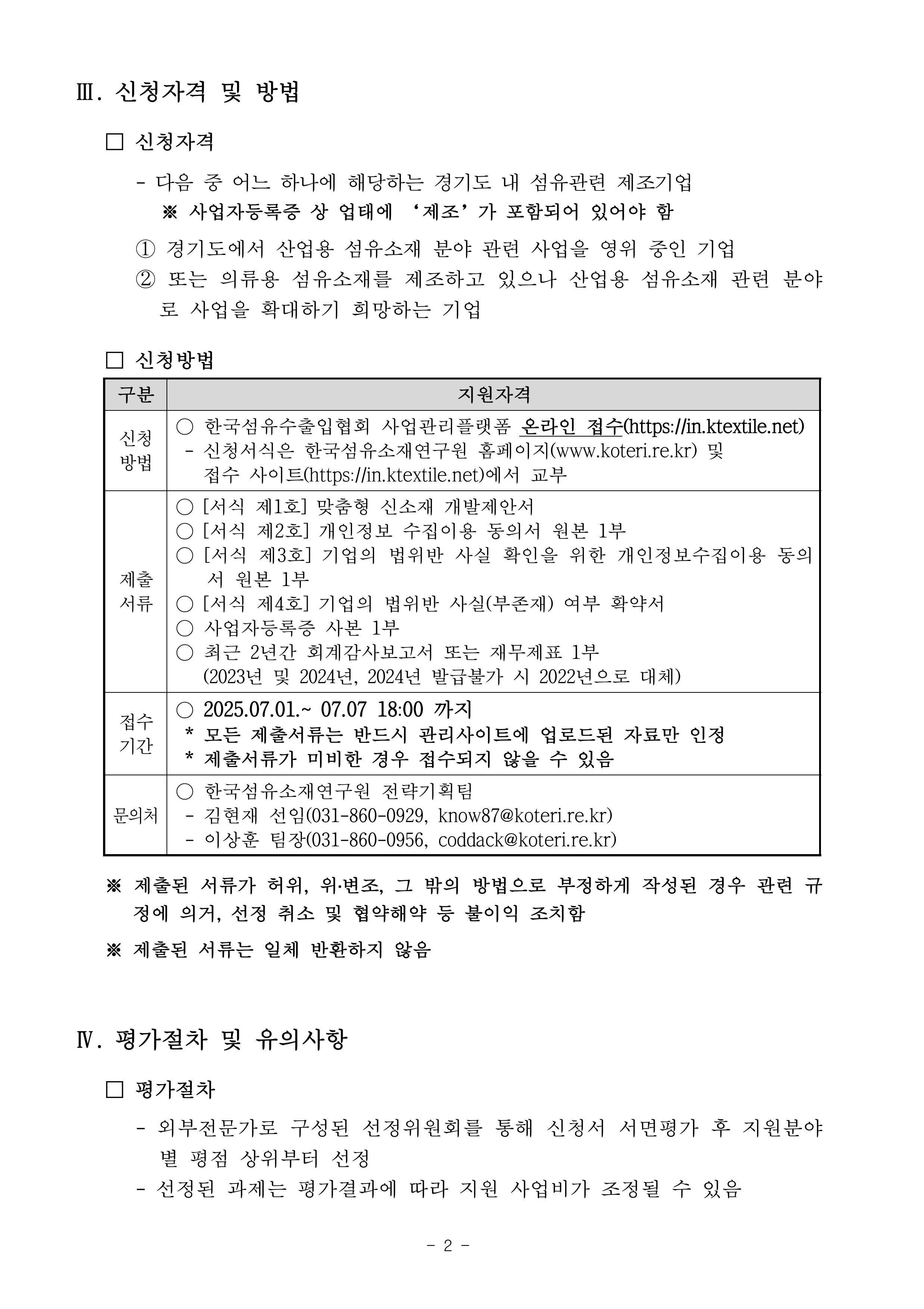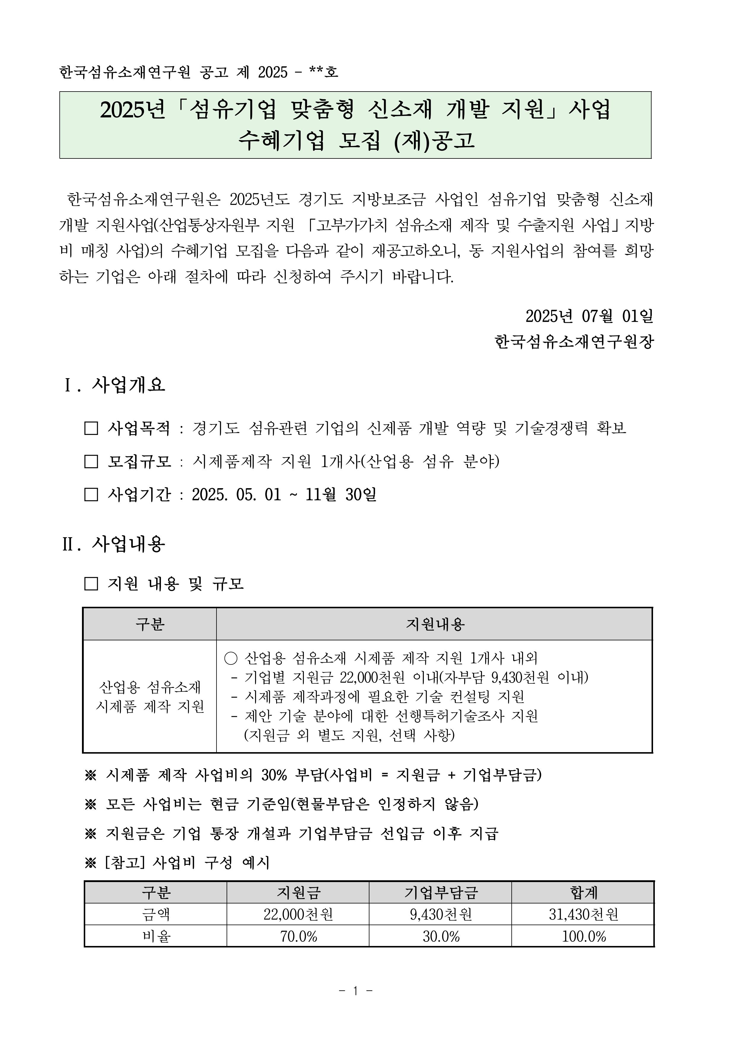 | 공고명 | 2025년도「섬유기업 맞춤형 신소재 개발 지원」사업 수혜기업 모집 공고 | ||||||||||||||||||||||||||||||||||||||