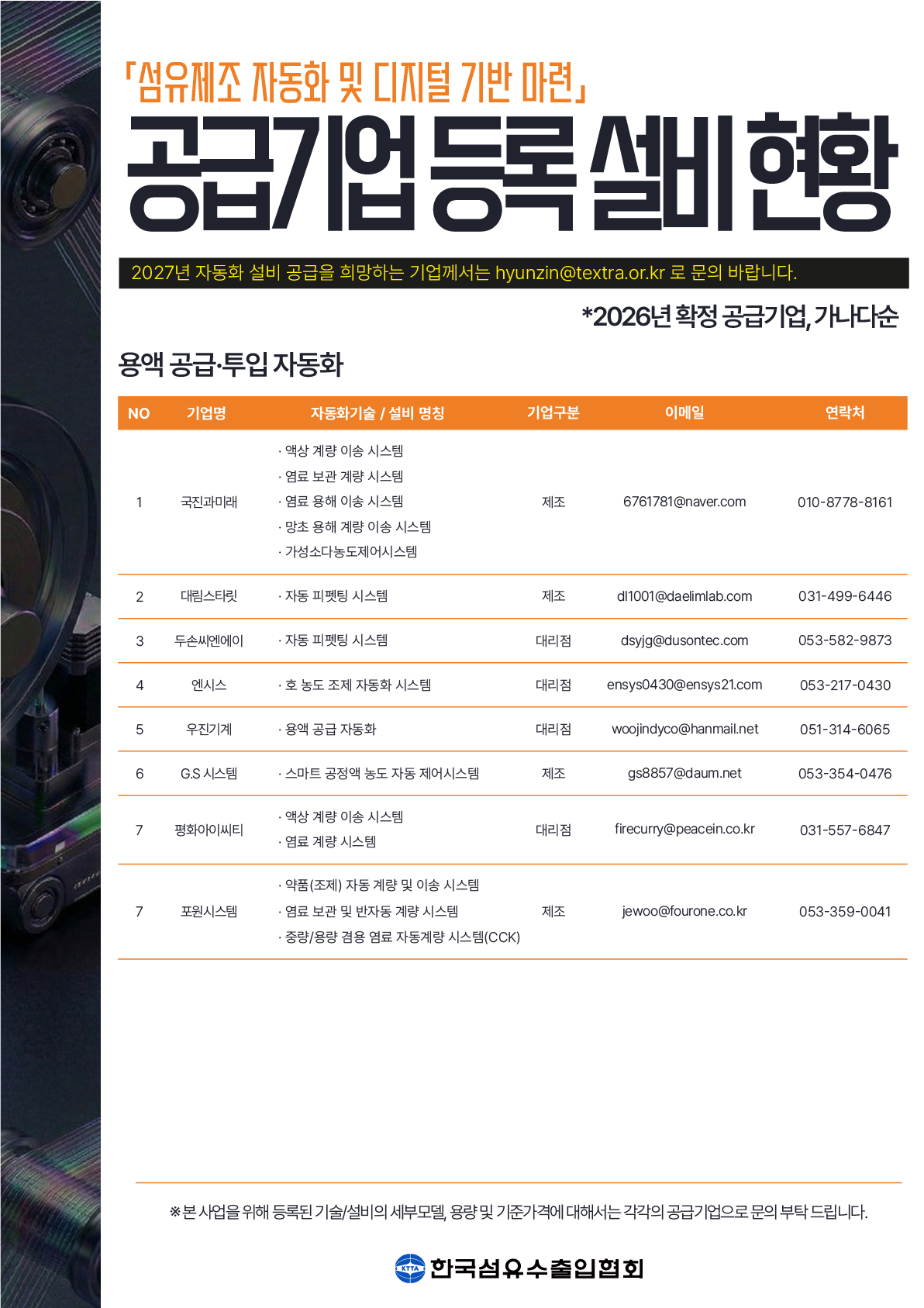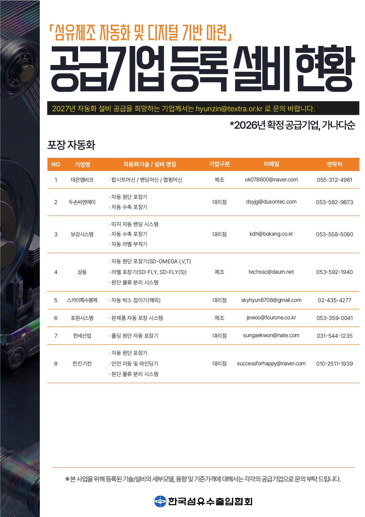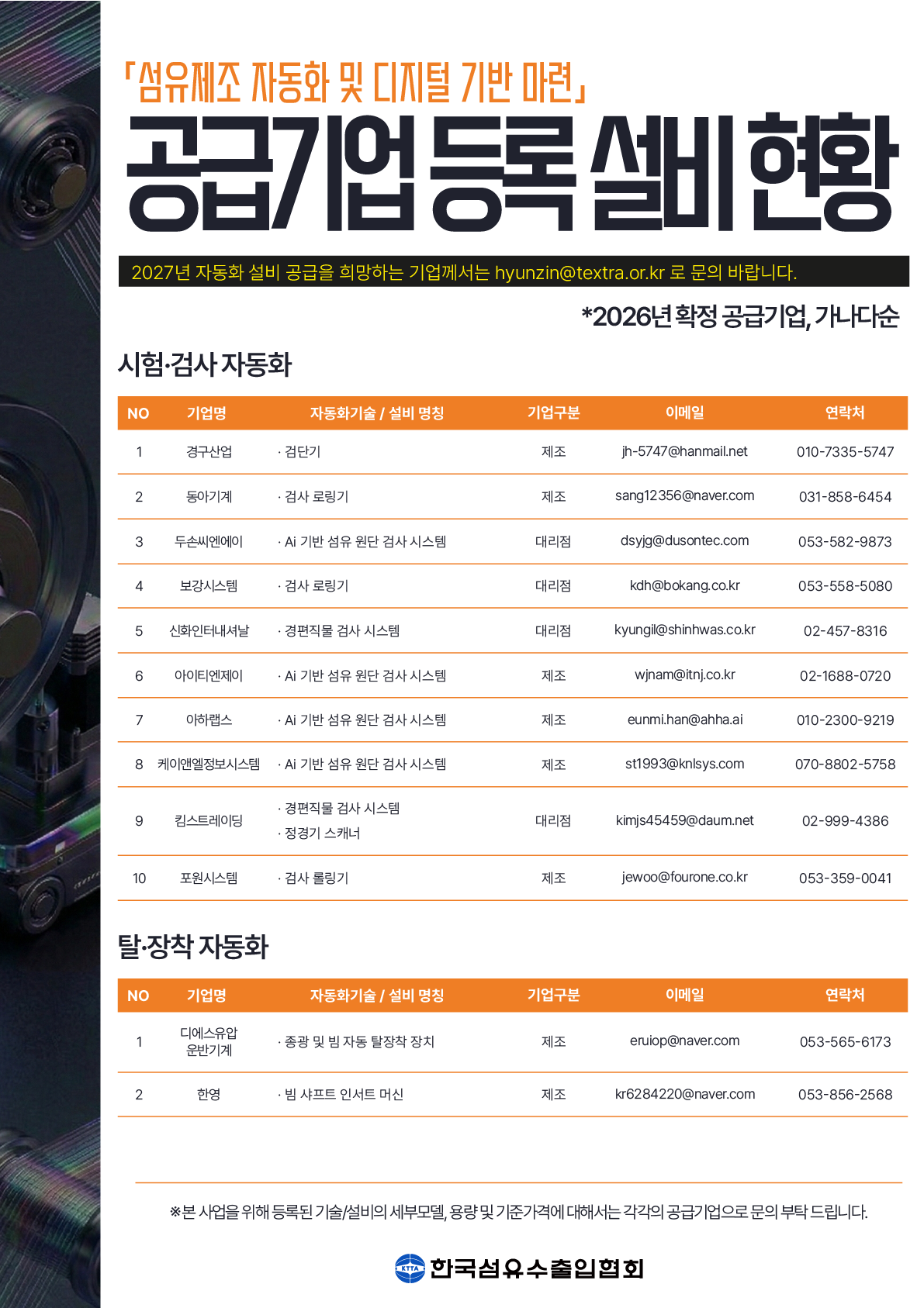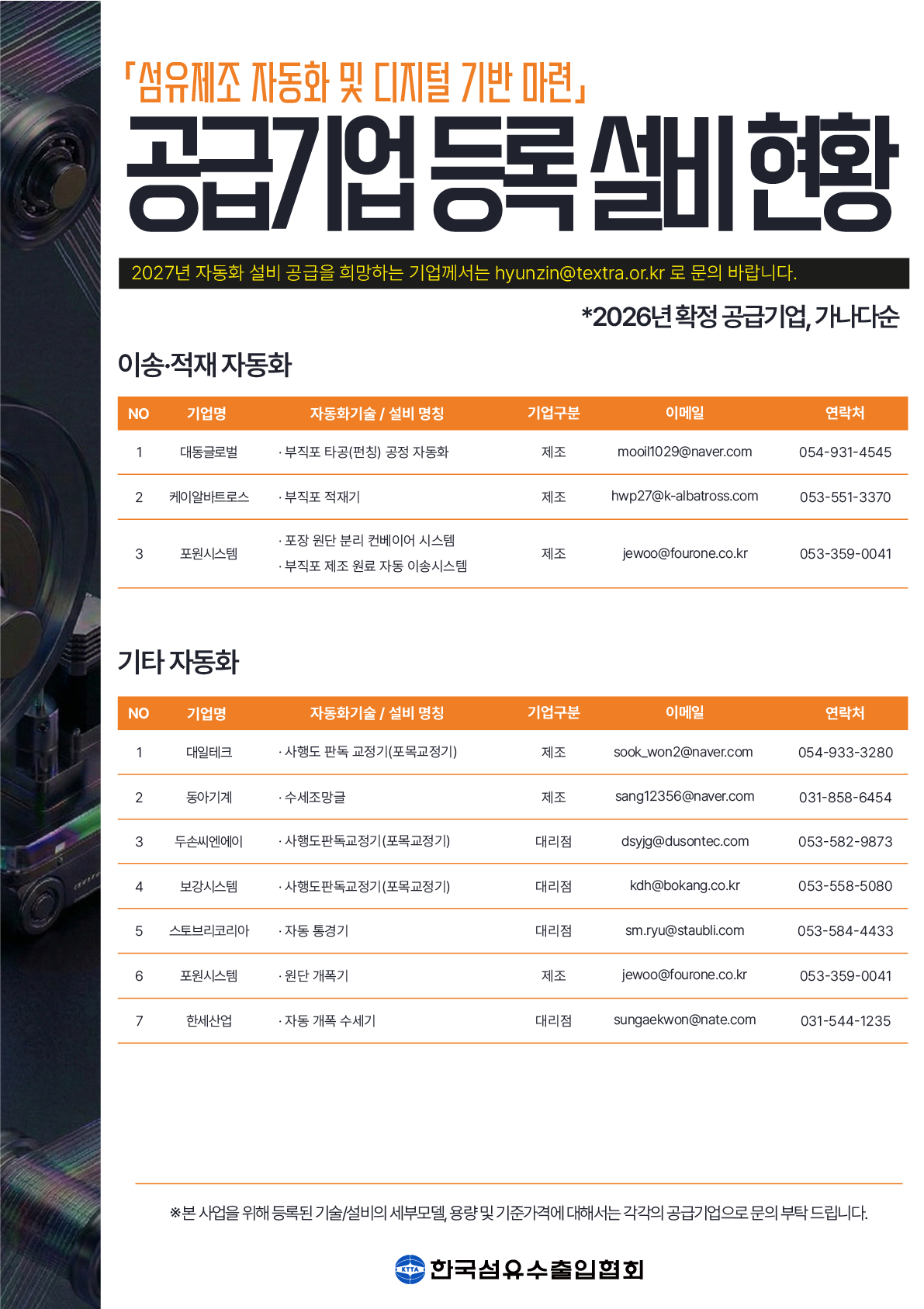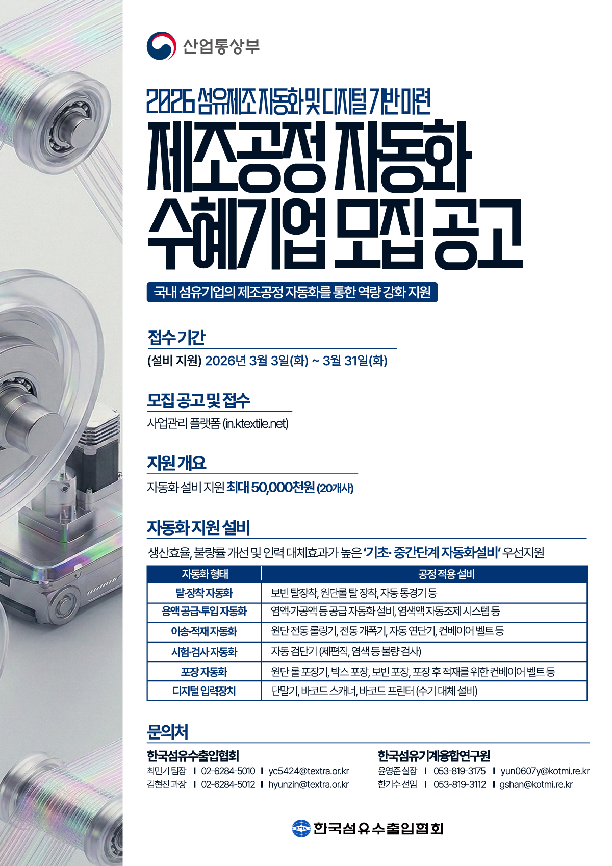 | 공고명 | 2026년 「섬유 제조공정 자동화」'자동화 설비지원' 수혜기업 모집 공고 | ||||||||||||||||||||||||||||||||||||||||||||||||||||||||||||||||